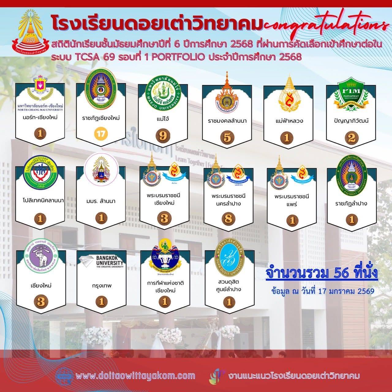 Post published:28 มกราคม 2026 Post category:ข่าวประชาสัมพันธ์ โรงเรียนดอยเต่าวิทยาคม ขอแสดงความยินดีกับนักเรียนที่ได้ ผ่านการคัดเลือกบุคคลเข้าศึกษาต่อในระดับสูงขึ้นไป ปีการศึกษา 2568 ระบบ TCAS 69 รอบ 1 PORTFOLIO จำนวน 56 ที่นั่ง ร่วมเรียนรู้ ก้าวสู่อนาคต ที่ ดอยเต่าวิทยาคม “Learn Together, Future Focus” ข้อมูล: งานแนะแนว #dtschool #โรงเรียนดอยเต่าวิทยาคม #เยาวชนดอยเต่าหมู่เฮามีดี #โรงเรียนดีต้องโรงเรียนเราดอยเต่าวิทยาคม #LearnTogetherFutureFocus #ร่วมเรียนรู้ก้าวสู่อนาคตที่ดอยเต่าวิทยาคม แชร์เลย : You Might Also Like จัดประชุมคณะกรรมการสถานศึกษาขั้นพื้นฐาน ครั้งที่ 2 ประจำปีการศึกษา 2568 23 พฤษภาคม 2025 เข้าร่วมประชุมเชิงปฏิบัติการ การเขียนรายงานวิธีการและผลดำเนินงานของโรงเรียนในโครงการโรงเรียนมาตรฐานสากลด้วยเกณฑ์รางวัลคุณภาพ สพฐ. (OBECQA) 14 มีนาคม 2024 การนิเทศติดตามหนุนเสริมสถานศึกษา ภายใต้โครงการกลไกการขับเคลื่อนระบบนิเวศทางการศึกษา 25 พฤศจิกายน 2025