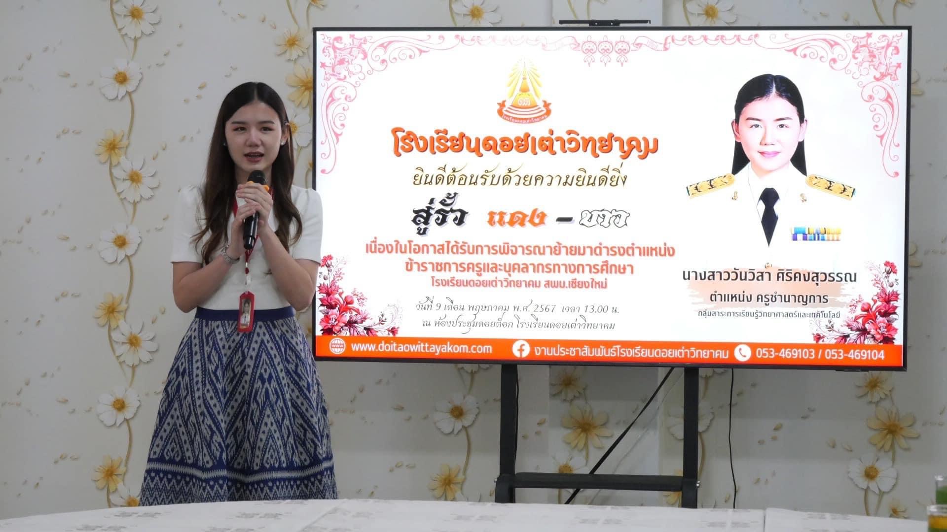ท่านผู้อำนวยการประพันธ์ บุญวรรณ์ มอบหมายให้ รองผู้อำนวยการวารุณี ธรรมขันธ์ รองผู้อำนวยการเอื้ออังกูร ชำนาญ ผู้ช่วยผู้อำนวยการ พร้อมด้วยคณะครูและบุคลากรทางการศึกษา กลุ่มสาระการเรียนรู้วิทยาศาสตร์และเทคโนโลยี โรงเรียนดอยเต่าวิทยาคม ให้การต้อนรับผู้บริหาร พร้อมด้วยคณะครูและบุคลากรทางการศึกษา โรงเรียนวังโป่งพิทยาคม และครอบครัวครูวันวิสา ในการร่วมแสดงความยินดีและให้การต้อนรับ