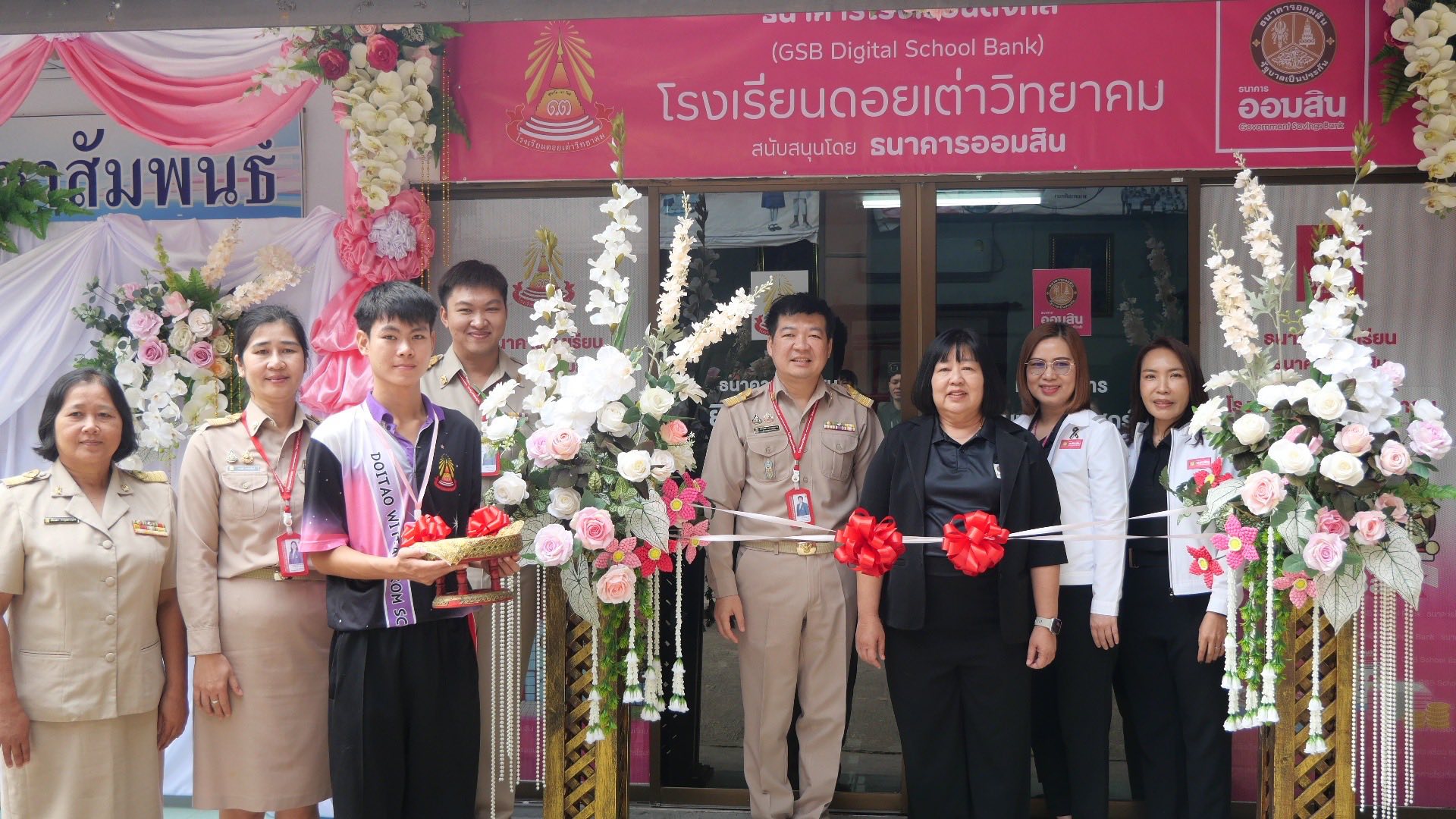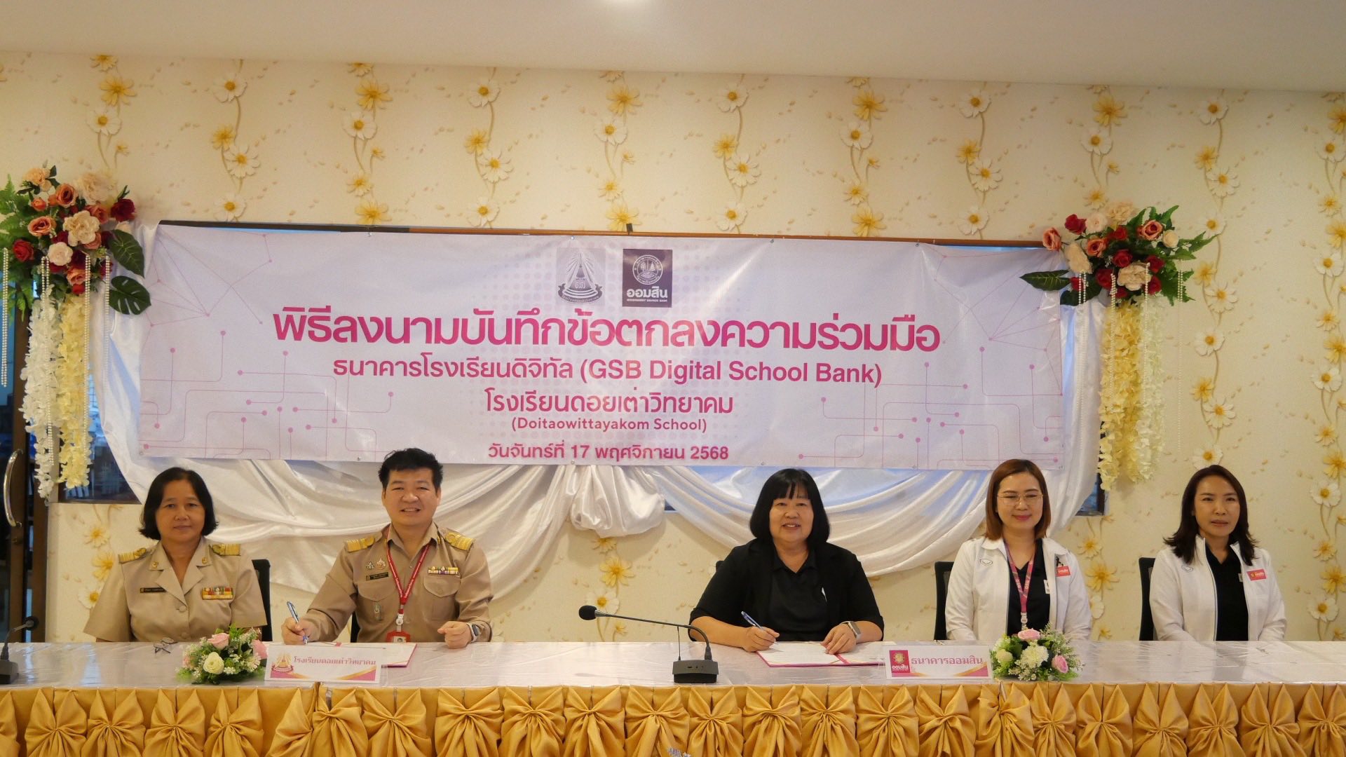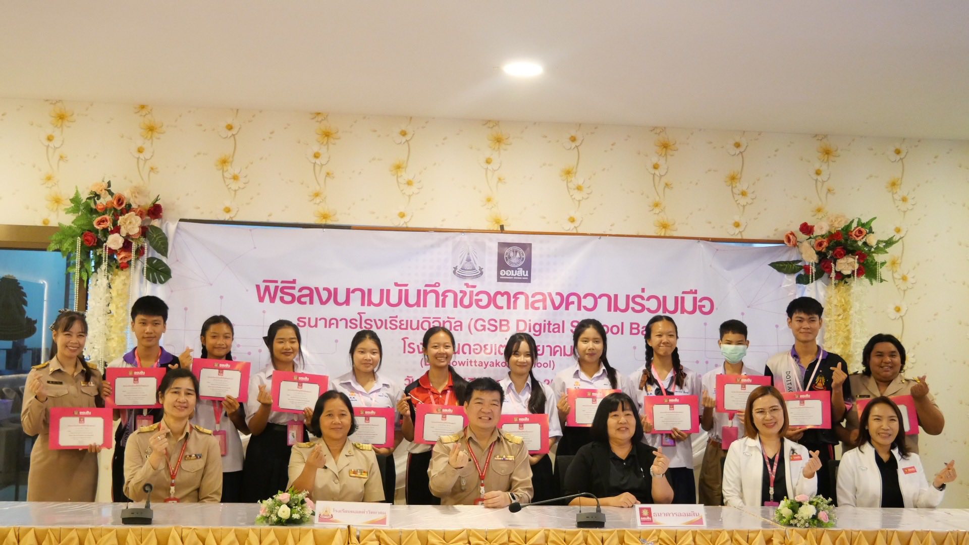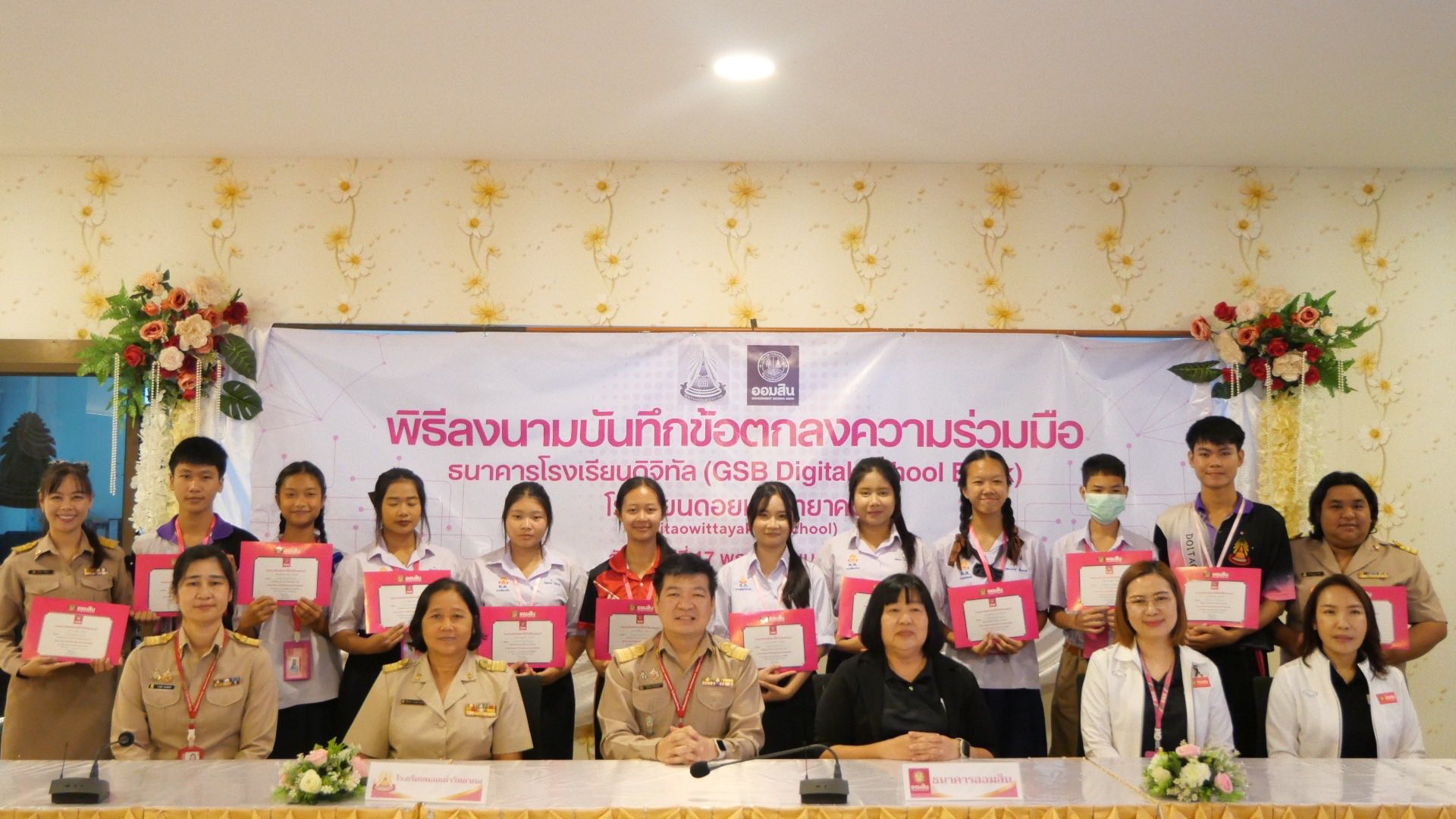 นายภานุรังษี คงธนกฤตกร ผู้อำนวยการโรงเรียนดอยเต่าวิทยาคม นางสาววารุณี ธรรมขันธ์ นายเอื้ออังกูร ชำนาญ รองผู้อำนวยการโรงเรียนดอยเต่าวิทยาคม พร้อมทั้งคณะครู และนักเรียนโรงเรียนดอยวิทยาคม เข้าร่วมลงนามบันทึกข้อตกลงความร่วมมือ ธนาคารโรงเรียนดิจิทัล (GSB Digital School Bank) และเปิดธนาคารโรงเรียนดิจิทัล ร่วมมือกันดําเนินการธนาคารโรงเรียนดิจิทัล (GSB Digital School Bank) ธนาคารออมสิน