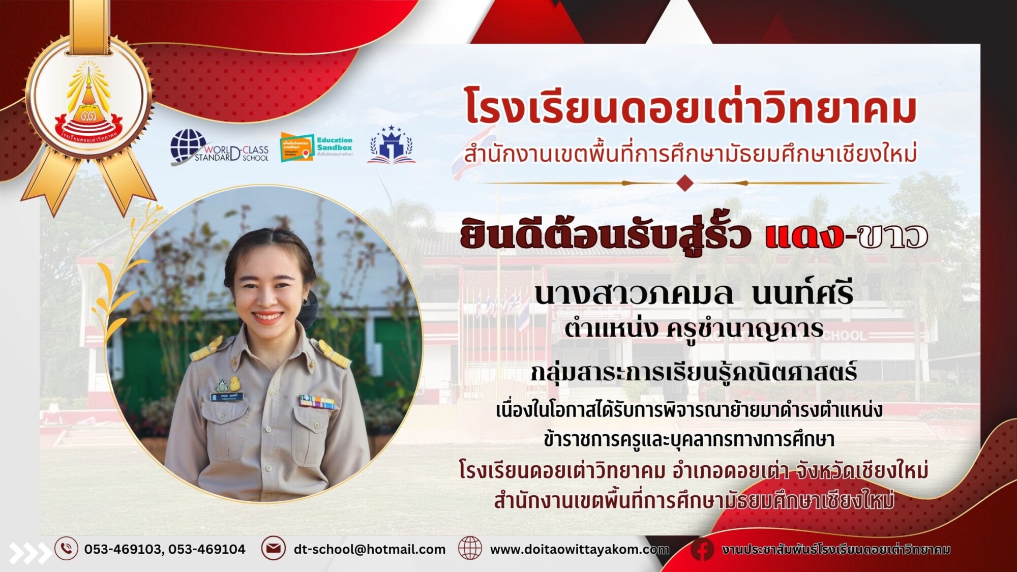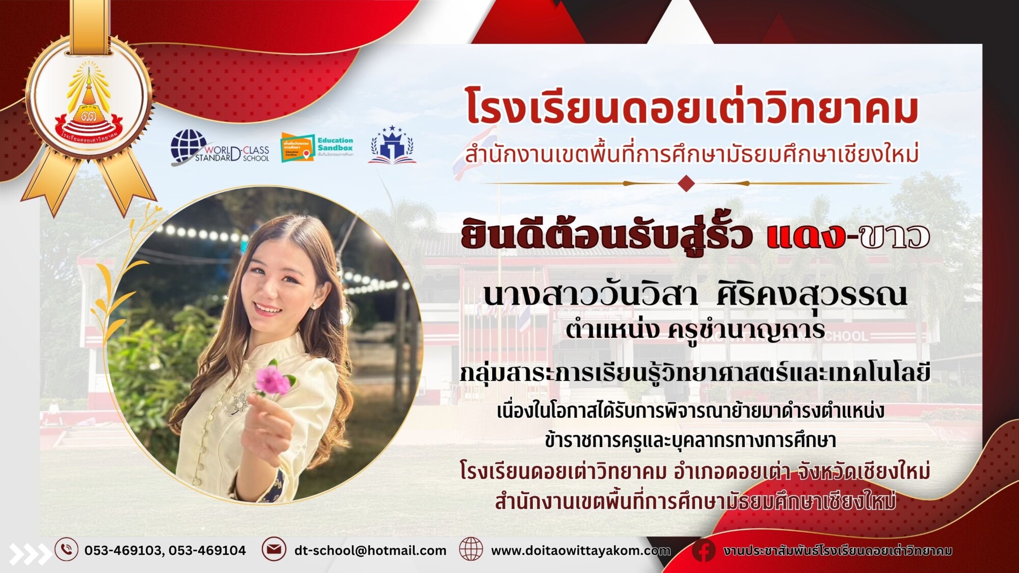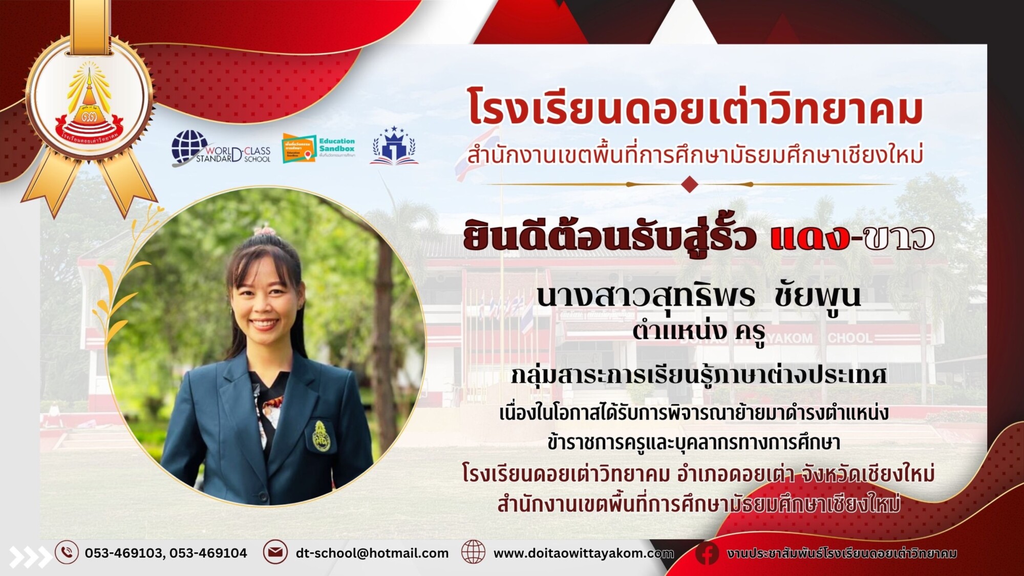Post published:23 เมษายน 2024 Post category:ข่าวประชาสัมพันธ์ Welcome to Doitaowittayakom School ❤️🤍 ยินดีต้อนรับคณะครูทุกท่านเป็นอย่างยิ่ง ที่ย้ายมาปฏิบัติหน้าที่ราชการ ตำแหน่งครู โรงเรียนดอยเต่าวิทยาคม แชร์เลย : You Might Also Like นักกีฬาตะกร้อชายหาดเยาวชนจังหวัดเชียงใหม่ เข้าร่วมพิธีส่งตัวนักกีฬา ตัวแทนภาค 5 เพื่อเข้าร่วมแข่งขันกีฬาเยาวชนแห่งชาติ ครั้งที่ 39 “ราชบุรีเกมส์” 19 มีนาคม 2024 หลักสูตรการสร้างนวัตกรรมการสอน “Generative AI Literacy for Education” ระยะที่ 3 12 มีนาคม 2026 บรรยากาศการหาเสียงของว่าที่คณะกรรมการสภานักเรียน 28 มกราคม 2026