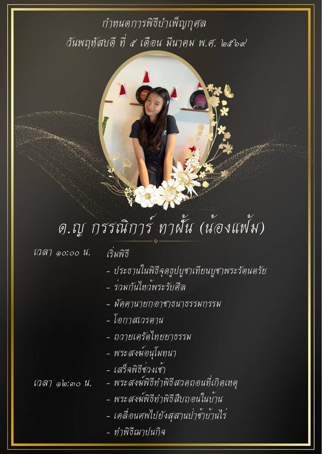 ดร.วิทยา พัฒนเมธาดา ประธานคณะกรรมการสถานศึกษาฯ โรงเรียนดอยเต่าวิทยาคม นายภานุรังษี คงธนกฤตกร ผู้อำนวยการโรงเรียนดอยเต่าวิทยาคม พร้อมด้วย ตัวแทนคณะกรรมการสถานศึกษาขั้นพื้นฐาน และในนามคณะครูและบุคลากรทางการศึกษา นักเรียนและผู้ปกครองโรงเรียนดอยเต่าวิทยาคม ร่วมงานบำเพ็ญกุศลศพ เด็กหญิงกรรณิการ์ ทาฝั้น ณ บ้านไร่ อำเภอดอยเต่า จังหวัดเชียงใหม่